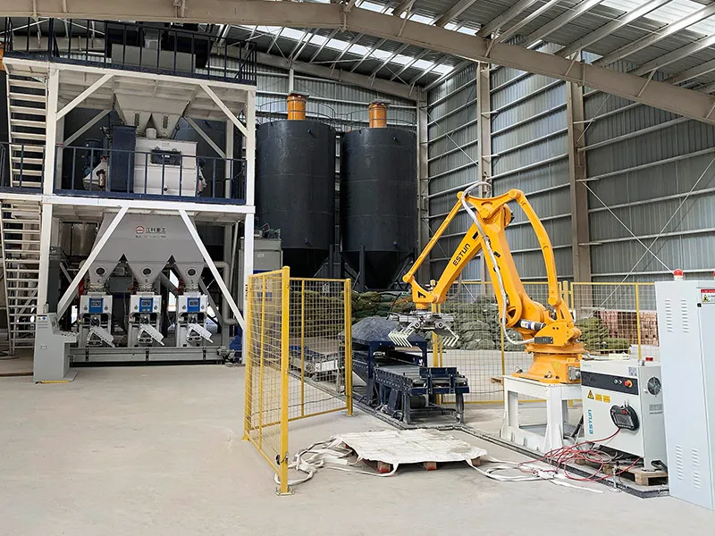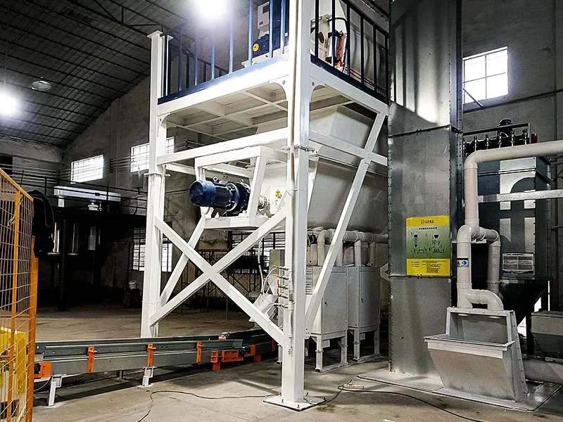 Линия по производству шпаклёвочных смесей, как правило, включает 3 сырьевых силоса. Один большой силос предназначен для навального цемента, один – для сухого песка, и один – для золы-уноса. Гранулированные материалы (например, перлит, пенополистирольные гранулы, стеклянные микросферы) после дозирования в специальном дозировочном бункере могут подаваться с помощью пневмотранспорта или ковшового элеватора. Прочие добавки обычно загружаются вручную. Для загрузки навального цемента и золы-уноса в силосы не требуется подъёмное оборудование – они подаются с помощью цементовоза. Сухой песок загружается в силос с помощью ковшового элеватора. Дозирующая система, совместно с дозирующими шнеками, подаёт сырьё из силосов в дозирующие бункеры. На основе данных, поступающих от датчиков, осуществляется точное дозирование сырья. После дозирования материалы с помощью шнековых конвейеров подаются в главный ковшовый элеватор, который поднимает их в бункер предварительного смешивания, расположенный над смесителем. Бункер предварительного смешивания оснащён пневматической широкоразмерной разгрузочной заслонкой, что позволяет быстро загружать подготовленные материалы в гравитационный смеситель, обеспечивая непрерывный процесс производства шпаклёвочного порошка.
