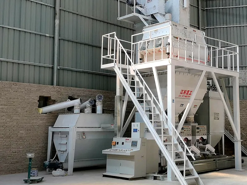 Оборудование для смешивания шпаклёвочных смесей, как правило, включает 3-6 сырьевых силосов. Два больших силоса предназначены для хранения основных компонентов, таких как карбонат кальция, а остальные силосы меньшего размера – для хранения легкого и тяжелого карбоната кальция, песка, добавок и других вспомогательных материалов. Для загрузки легкого и тяжелого карбоната кальция, песка, добавок и т.д. в малые силосы используются ковшовые элеваторы. Продуманная система распределения материалов позволяет одному ковшовому элеватору осуществлять распределительную работу, тем самым исключая нерациональное использование ресурсов. Дозирующая система, совместно с дозирующими шнеками, подаёт сырьё из силосов в дозирующие бункеры. На основе данных, поступающих от датчиков, осуществляется точное дозирование сырья. После дозирования материалы с помощью шнековых конвейеров подаются в главный ковшовый элеватор, который поднимает их в бункер предварительного смешивания, расположенный над смесителем. Бункер предварительного смешивания оснащён пневматической широкоразмерной разгрузочной заслонкой, что позволяет быстро загружать подготовленные материалы в гравитационный смеситель, обеспечивая непрерывный процесс производства шпаклёвочного порошка.